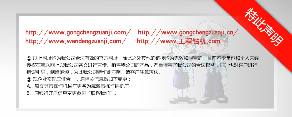 威海市棟恒鉆機(jī)廠隸屬于文登市工程鉆機(jī)廠,主要生產(chǎn)、銷售工程鉆機(jī)。它坐落于文登市西鋪頭工業(yè)園,這里科技發(fā)達(dá),交通便利,制造業(yè)集中。 自1982年建廠以來(lái),經(jīng)過(guò)多年的優(yōu)化改革和沉淀積累,擁有精密、大型加工設(shè)備近百臺(tái)的生產(chǎn)企業(yè)之一?,F(xiàn)在研制成功的GJ-400、GJ-250S、GJ-250A、GJ-240S、GJ-240A、GJ-180S、GJ-180A型等鉆機(jī)。在其它產(chǎn)品上,企業(yè)建立了長(zhǎng)期、中期、短期的發(fā)展規(guī)劃,一系列的高性能產(chǎn)品正在不斷推出中,企業(yè)應(yīng)市場(chǎng)需求對(duì)系列產(chǎn)品進(jìn)行了優(yōu)化組合,開發(fā)了與之對(duì)應(yīng)配套的三腿、四腿單天車輪、雙天車輪鉆塔;泥漿泵—BW-160Q、BW- 200Q型球形閥泥漿泵大大提高了泵的使用性能和機(jī)械效率